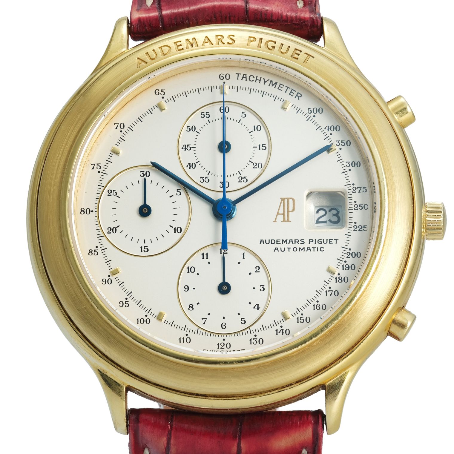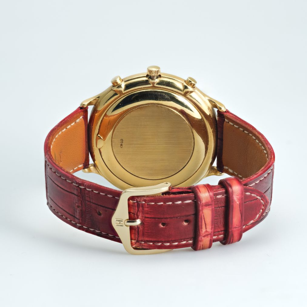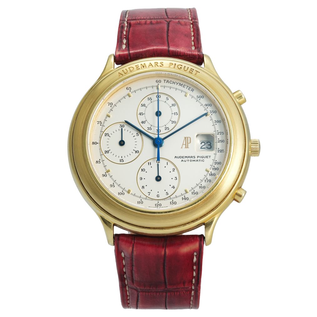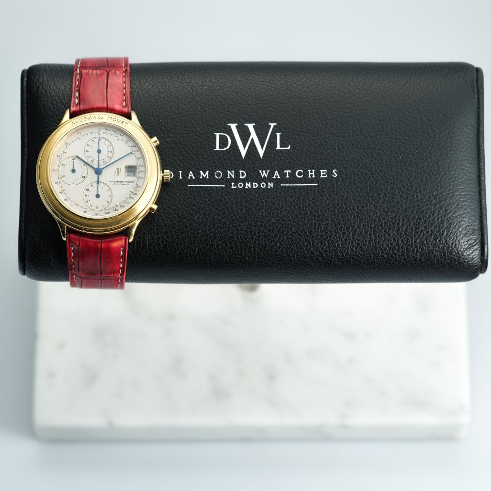 The Audemars Piguet Chronograph Ref. 25644 combines classical design with mechanical sophistication. Its 40mm yellow gold case frames a silver dial with three chronograph registers, blue hands, a tachymeter scale, and a discreet date display at 3 o’clock. Powered by an automatic movement, this 2001 piece reflects the brand’s mastery in blending elegance with technical chronograph functionality. Offered on a leather strap, it is in very good condition though accompanied without original box or papers. A refined collector’s choice, it highlights Audemars Piguet’s craftsmanship beyond the Royal Oak line.