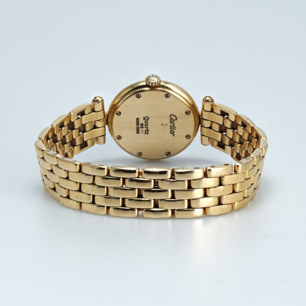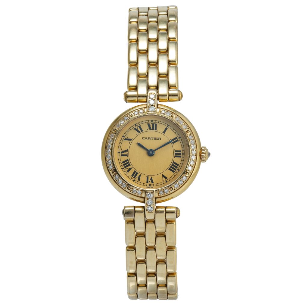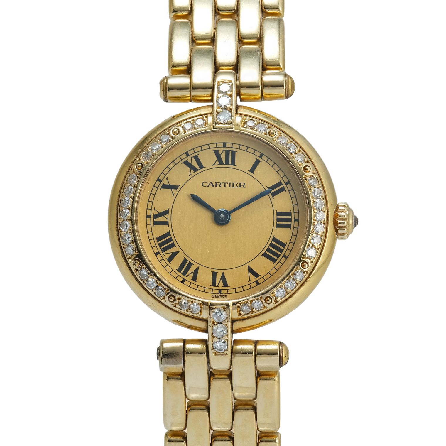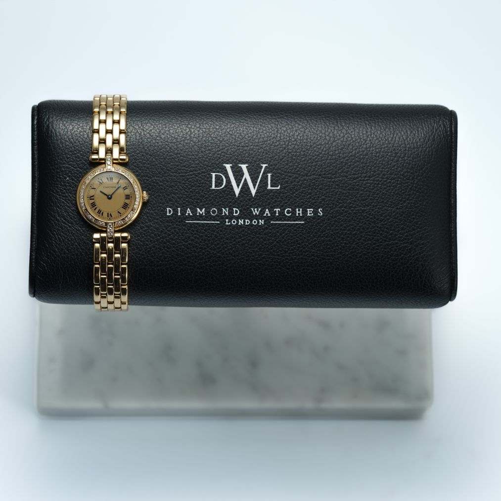 This Cartier Panthère Vendôme epitomises refined luxury with its rich yellow-gold case and matching bracelet, elevated further by a diamond-set bezel that adds radiant sparkle and sophistication. The champagne dial enhances the warm tones of the gold, creating a harmonious and elegant aesthetic, while classic Cartier elements — including Roman numerals and blued-steel hands — deliver timeless style. Its sleek profile and polished surfaces make this watch as suitable for formal occasions as it is for refined everyday wear.