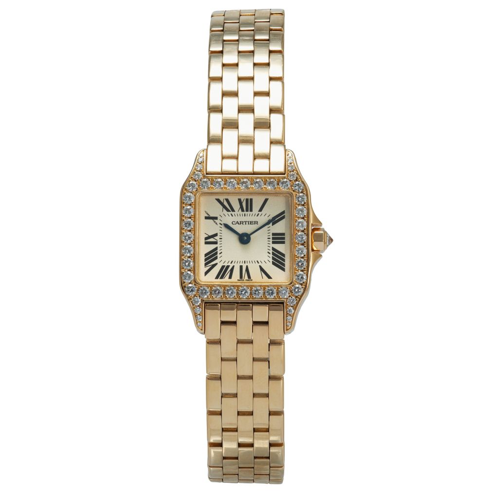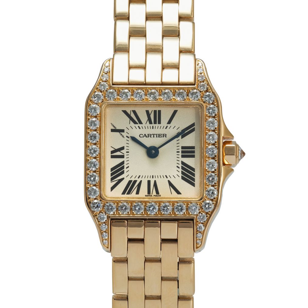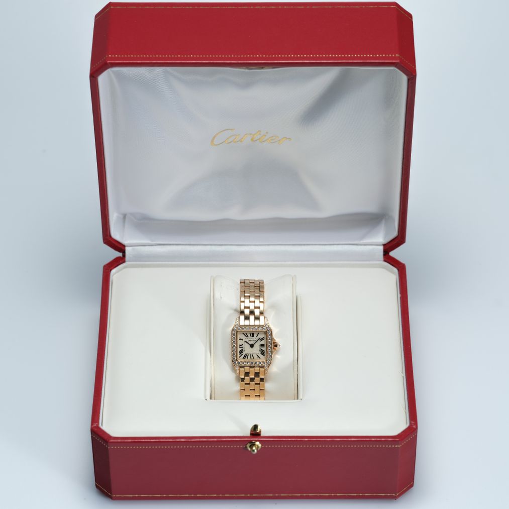 Powered by a precise and low-maintenance quartz movement, this Santos Demoiselle offers effortless timekeeping and practical wearability. The polished rose-gold case and diamond bezel add radiant allure, while the integrated bracelet or strap ensures comfortable wear throughout the day. With its blend of iconic Cartier design, luxurious materials, and understated charm, this rose-gold Santos Demoiselle is a standout choice for anyone seeking a classic yet refined luxury timepiece.
