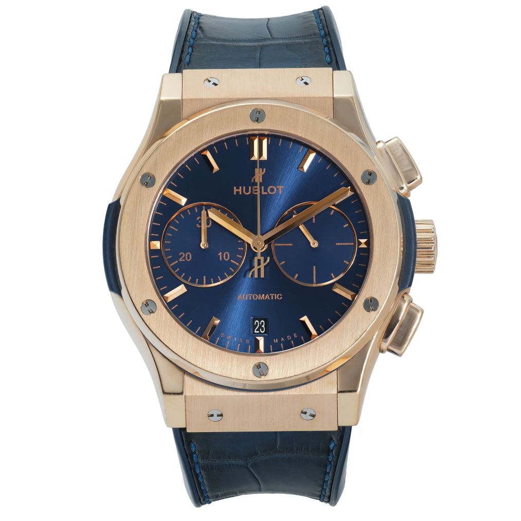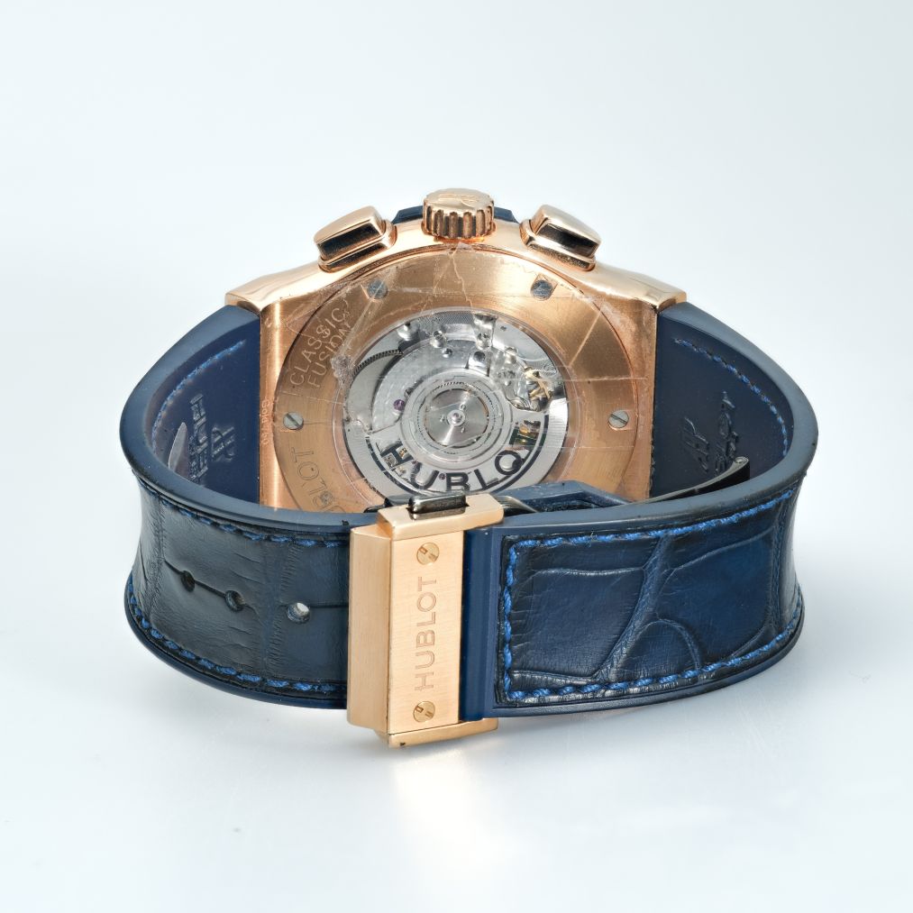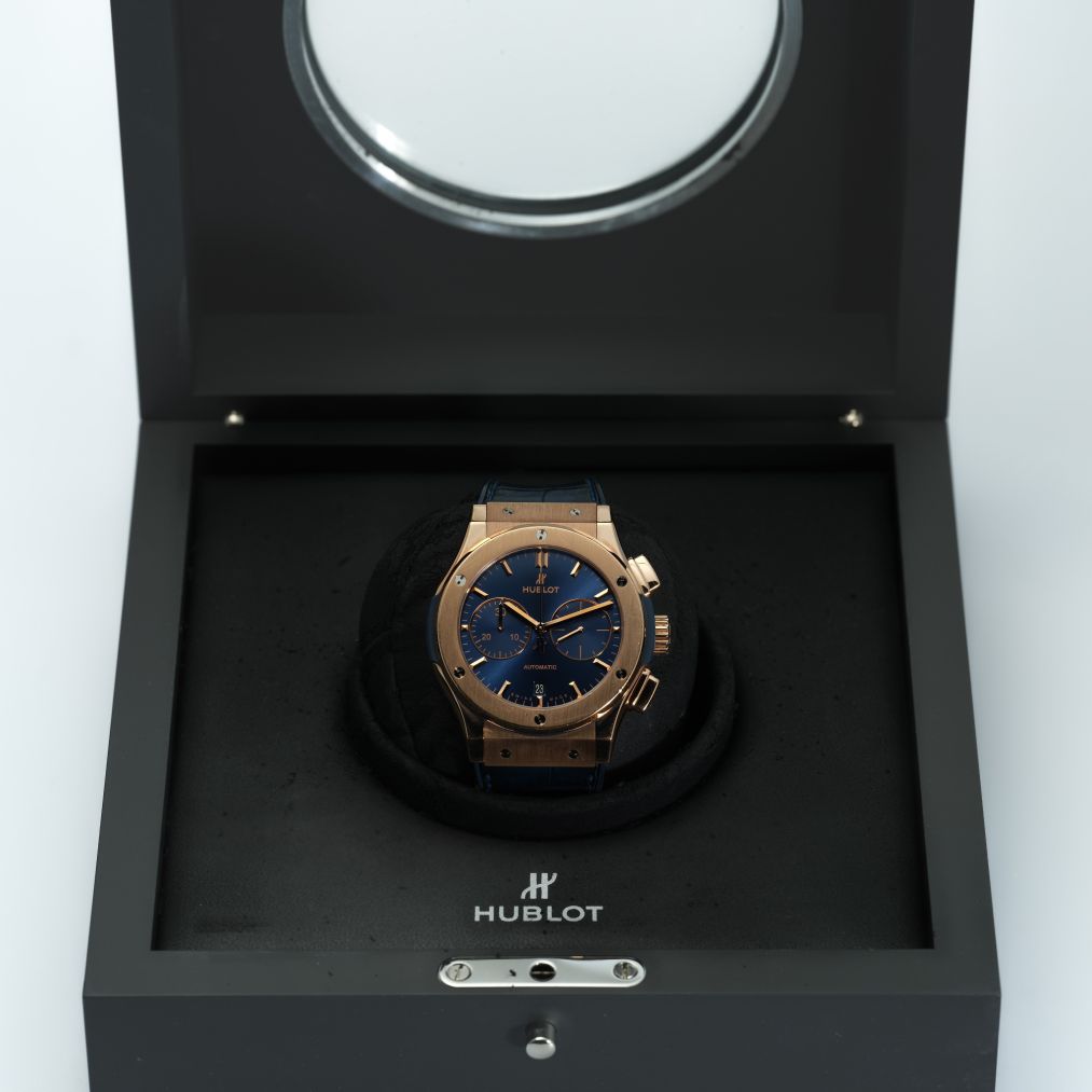 The Hublot Classic Fusion Chronograph King Gold Blue Ref. 541.OX.7180.RX pairs understated elegance with contemporary sportiness. Measuring 42mm, the case is crafted from 18k King Gold, complemented by a matching rose gold bezel and secured with a blue rubber strap for comfort and versatility. Its striking blue sunray dial hosts twin chronograph counters, rose gold baton markers, and a discreet date aperture at 6 o’clock. Powered by an automatic movement, this 2024 example is presented in very good condition with its original box (papers not included). A refined choice within the Classic Fusion line, balancing modern functionality with timeless luxury.