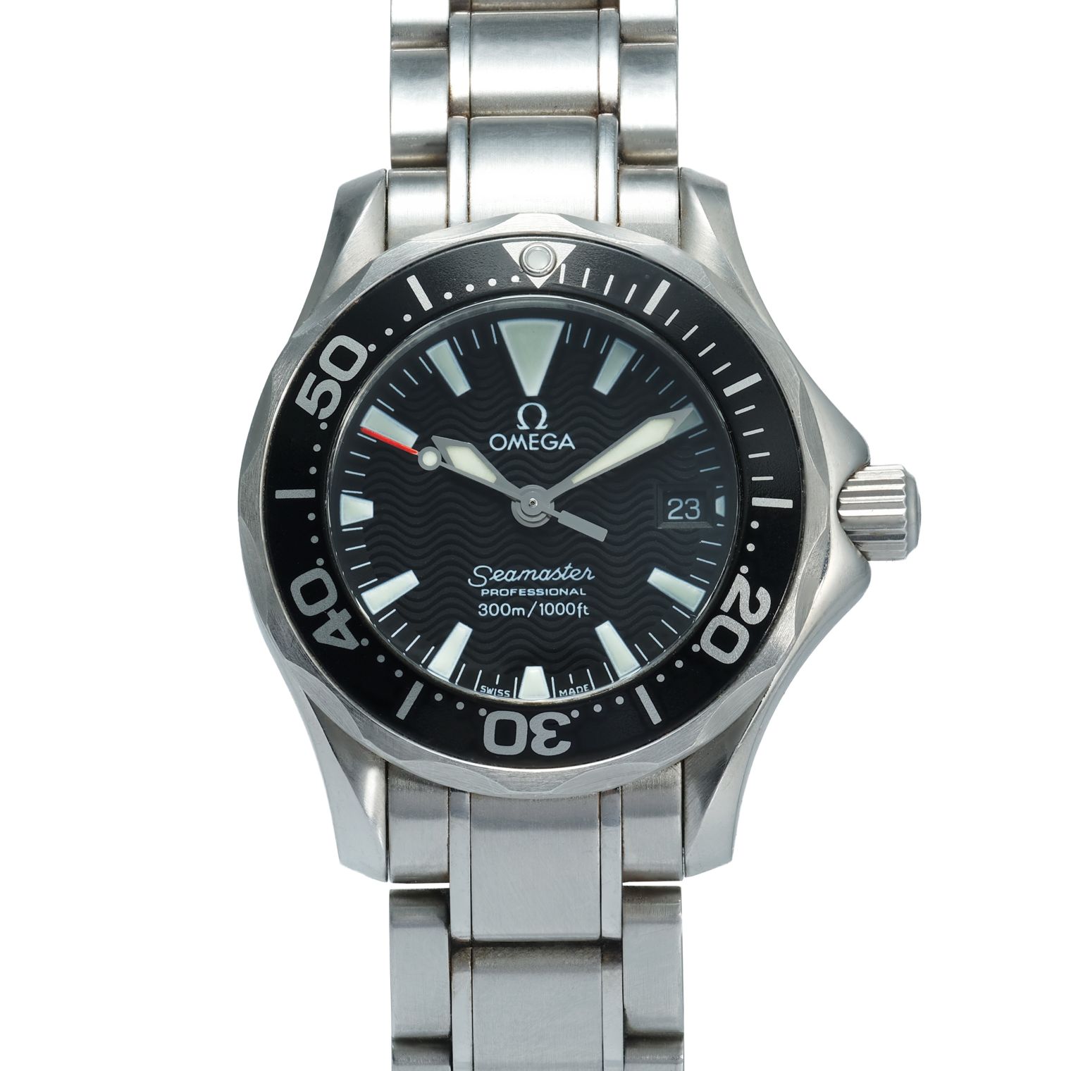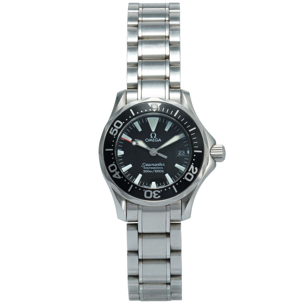 This Omega Seamaster in stainless steel combines rugged dive-watch capability with a sleek and versatile aesthetic, highlighted by its striking black dial. The bold markers and luminous hands ensure excellent legibility both above and below the surface, while the unidirectional rotating bezel reinforces the model’s strong nautical heritage. The robust case and bracelet deliver durability and comfort, making this Seamaster equally suited to active pursuits or everyday wear.