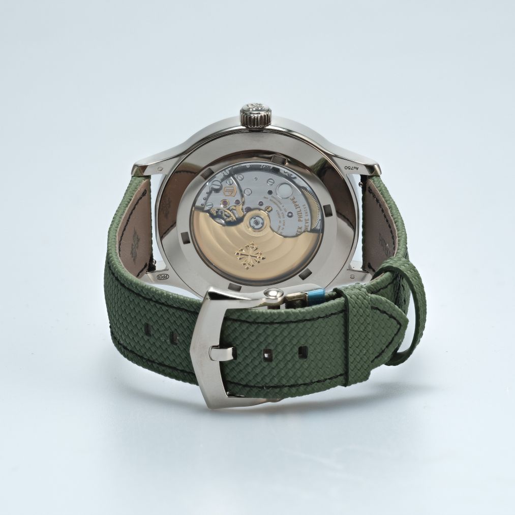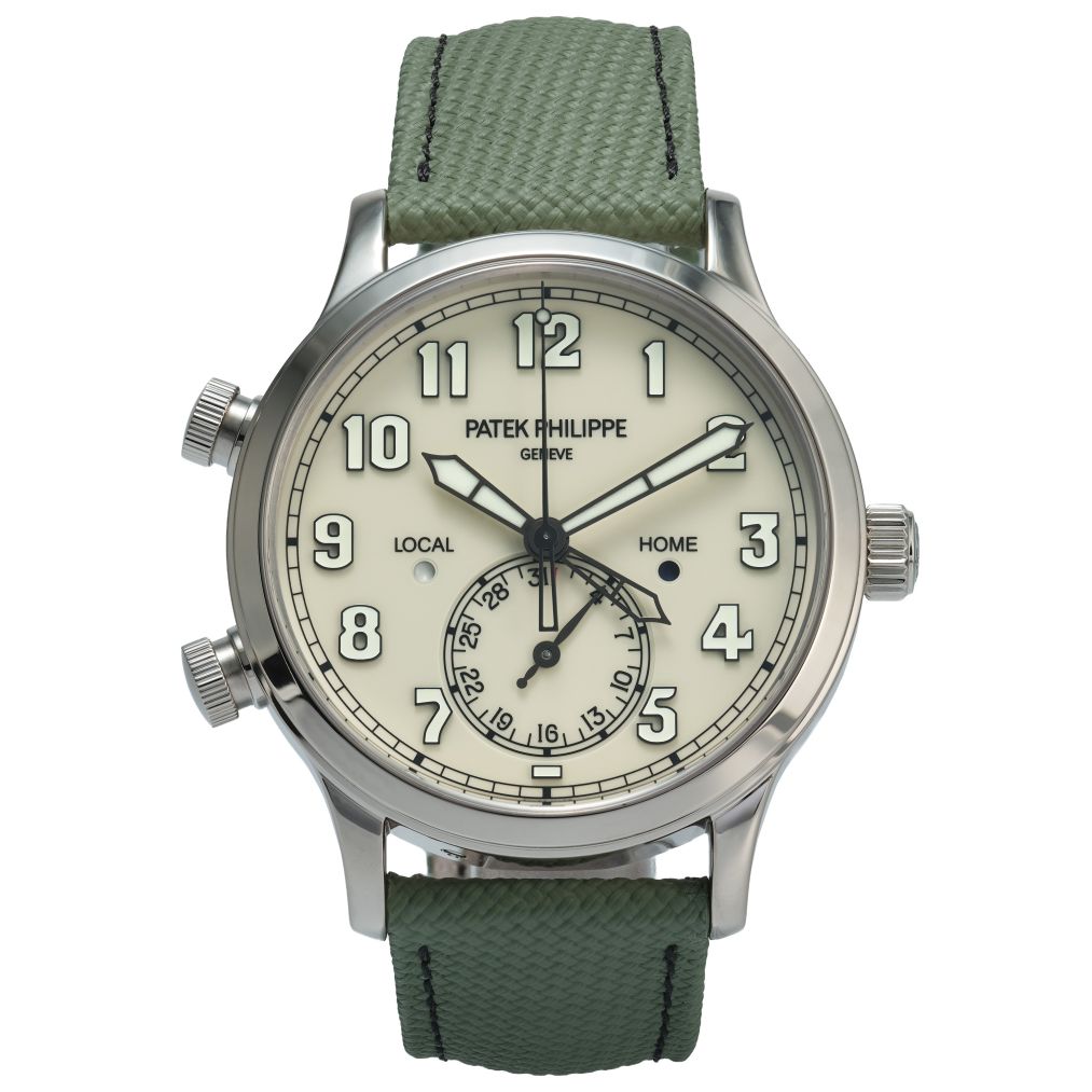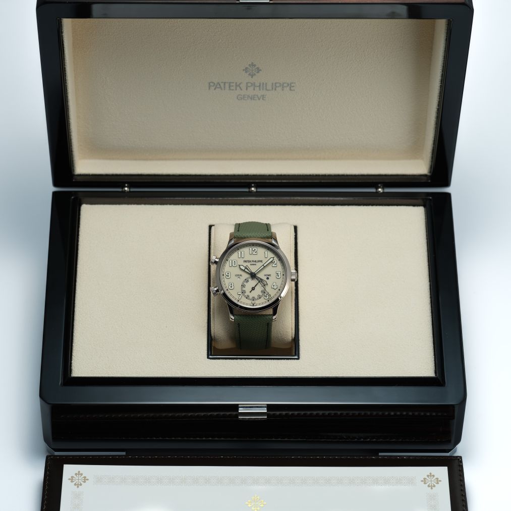 Framed in a white-gold case and paired with a durable textile strap, this model balances sporty character with high-end luxury. The combination of rugged strap material and precious metal case brings versatility to the piece, suitable for active use yet refined enough for more formal settings. Powered by an automatic movement and protected by a sapphire crystal, the Calatrava Pilot Travel Time delivers reliable precision and enduring performance, standing out as a distinctive choice for anyone seeking a sophisticated timepiece that merges aviation heritage with Patek Philippe’s signature craftsmanship.