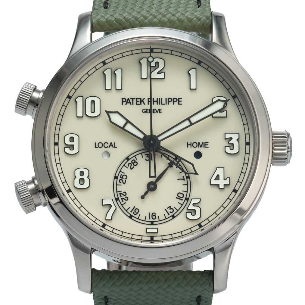 This Patek Philippe Calatrava Pilot Travel Time in white gold presents a refined take on the classic pilot’s watch, combining robust functionality with elegant materials and finishing. The warm champagne dial offers rich contrast against bold hour markers and distinctive hands, ensuring excellent legibility while adding a touch of timeless sophistication. Designed with dual-time capability — a hallmark of the Travel Time series — the additional hour hand and day/night indicators allow effortless tracking of two time zones, making it an excellent companion for the global traveller who values both practicality and prestige.