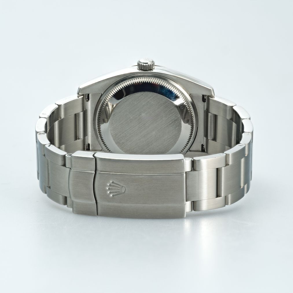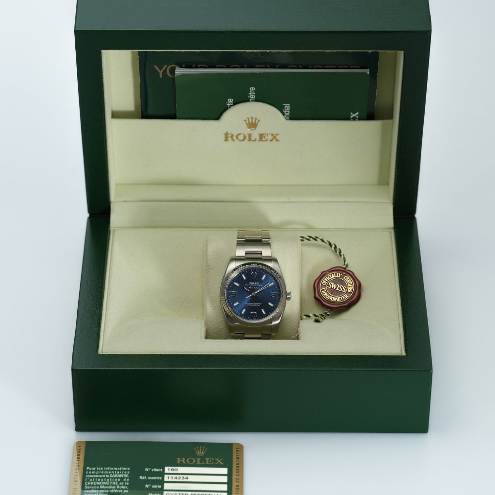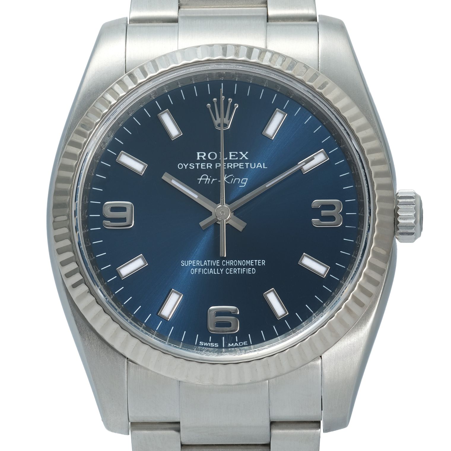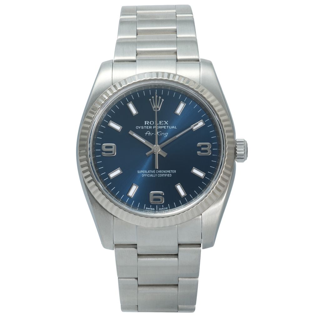 The Rolex Air-King Ref. 114234 offers a refined twist on one of Rolex’s most understated collections, distinguished by its blend of elegance and sportiness. Measuring 34mm, the stainless steel case is complemented by a fluted white gold bezel, adding a subtle touch of luxury to the otherwise minimalist design. Its deep blue dial features applied indices alongside bold Arabic numerals at 3, 6, and 9, creating excellent legibility and balance. Powered by an automatic movement and protected by a sapphire crystal, the watch is fitted with a stainless steel Oyster bracelet that completes its versatile character. Produced in 2012, this example is preserved in very good condition and is accompanied by both its original box and papers, making it an appealing choice for those seeking a compact yet distinctive Rolex that bridges everyday practicality with refined aesthetics.