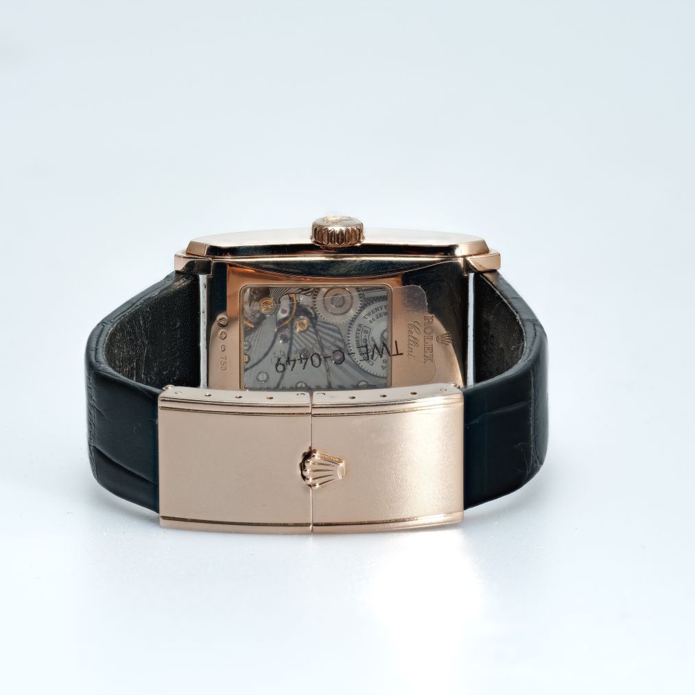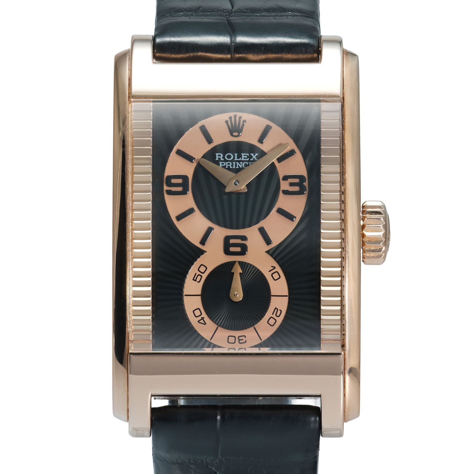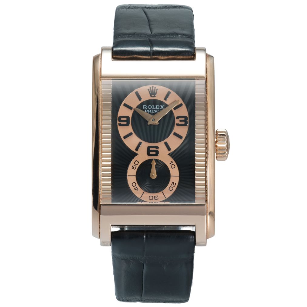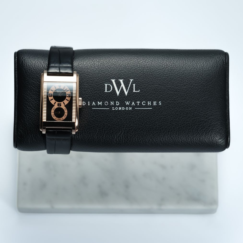 This Rolex Cellini Prince ref. 5442/5 is a distinctive and elegant dress watch, defined by its rectangular Everose gold case and Art Deco–inspired dual-register dial. The black and rose-toned layout creates strong visual contrast, while the sapphire crystal and refined finishing highlight the craftsmanship that makes the Prince line stand out within Rolex’s catalogue. Its manual-winding movement reflects the traditional watchmaking approach that sets this model apart from the brand’s more common automatic offerings.