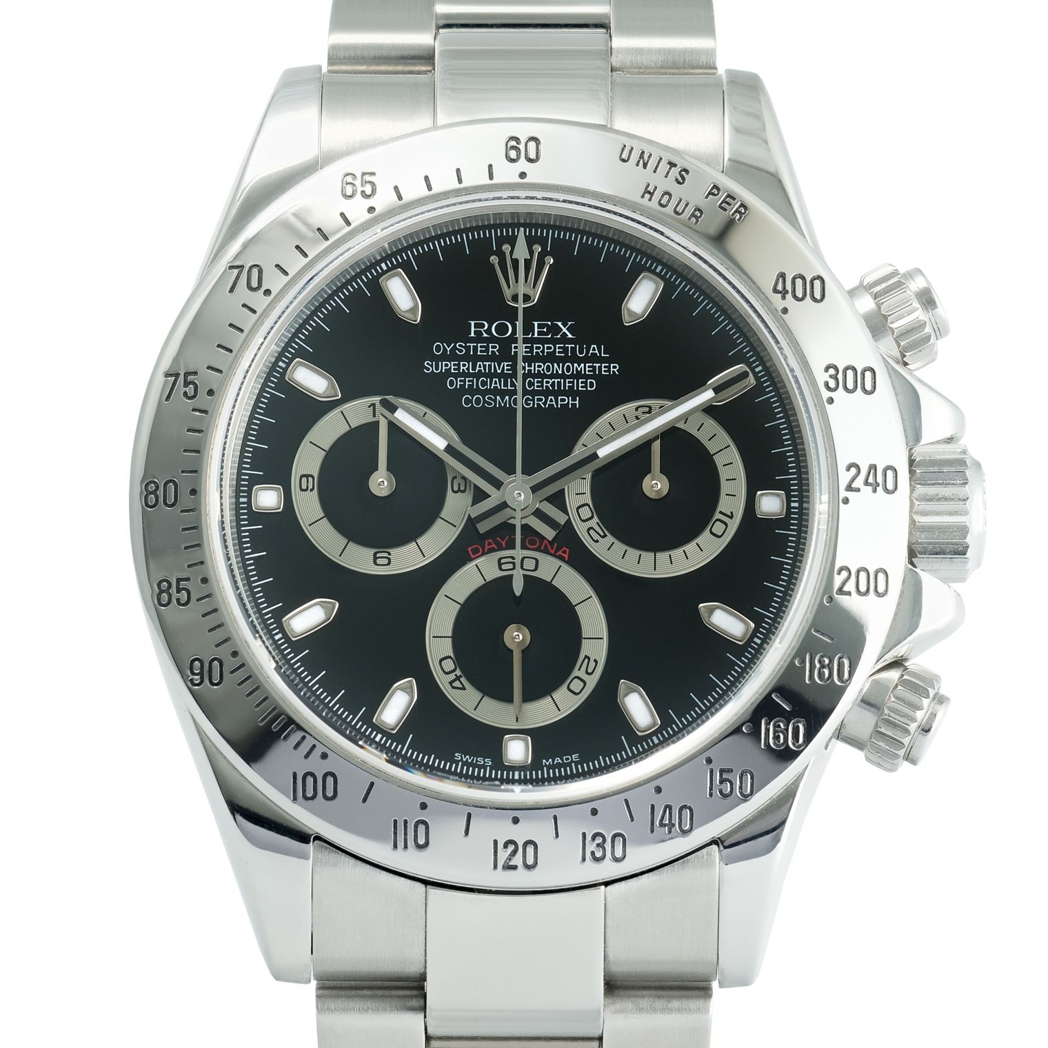 This Rolex Cosmograph Daytona in stainless steel exemplifies the perfect union of high-performance engineering and timeless design, featuring a bold black dial that delivers striking contrast against its polished steel case and bracelet. The iconic tri-subdial chronograph configuration — a signature of the Daytona lineage — is framed by an engraved tachymeter bezel, allowing precise measurement of average speeds over a given distance. With luminous hour markers and hands enhancing legibility, this model blends sporty functionality with classic Rolex aesthetics, making it as stylish on the street as it is capable on the track.