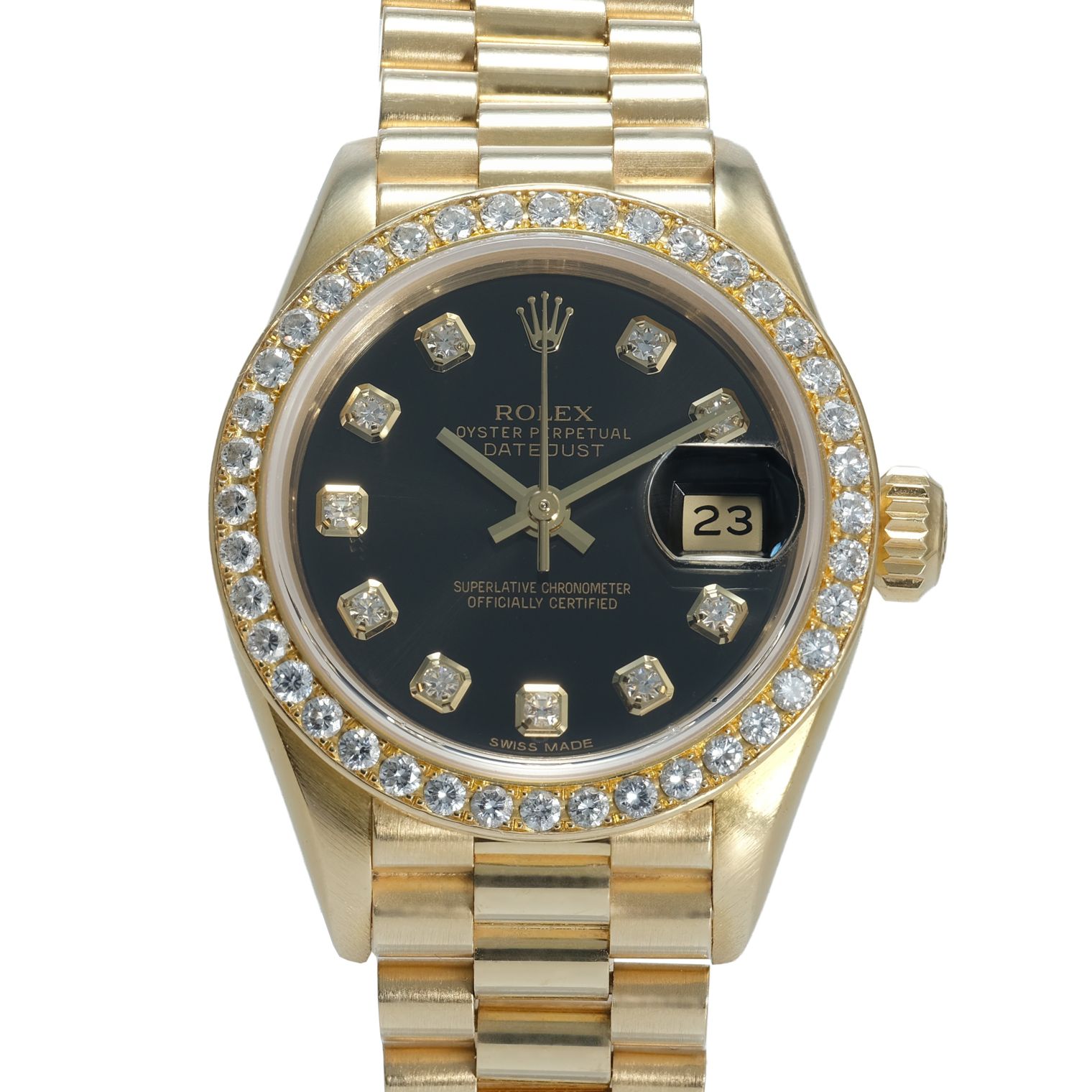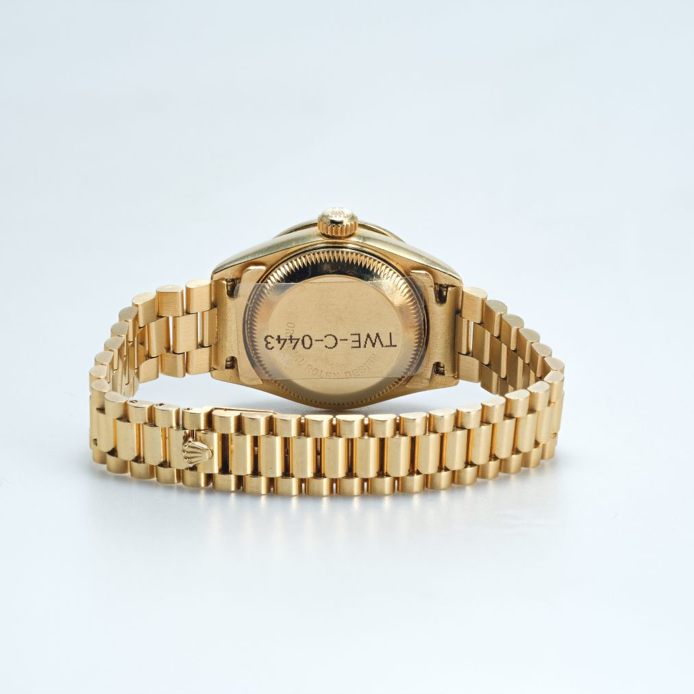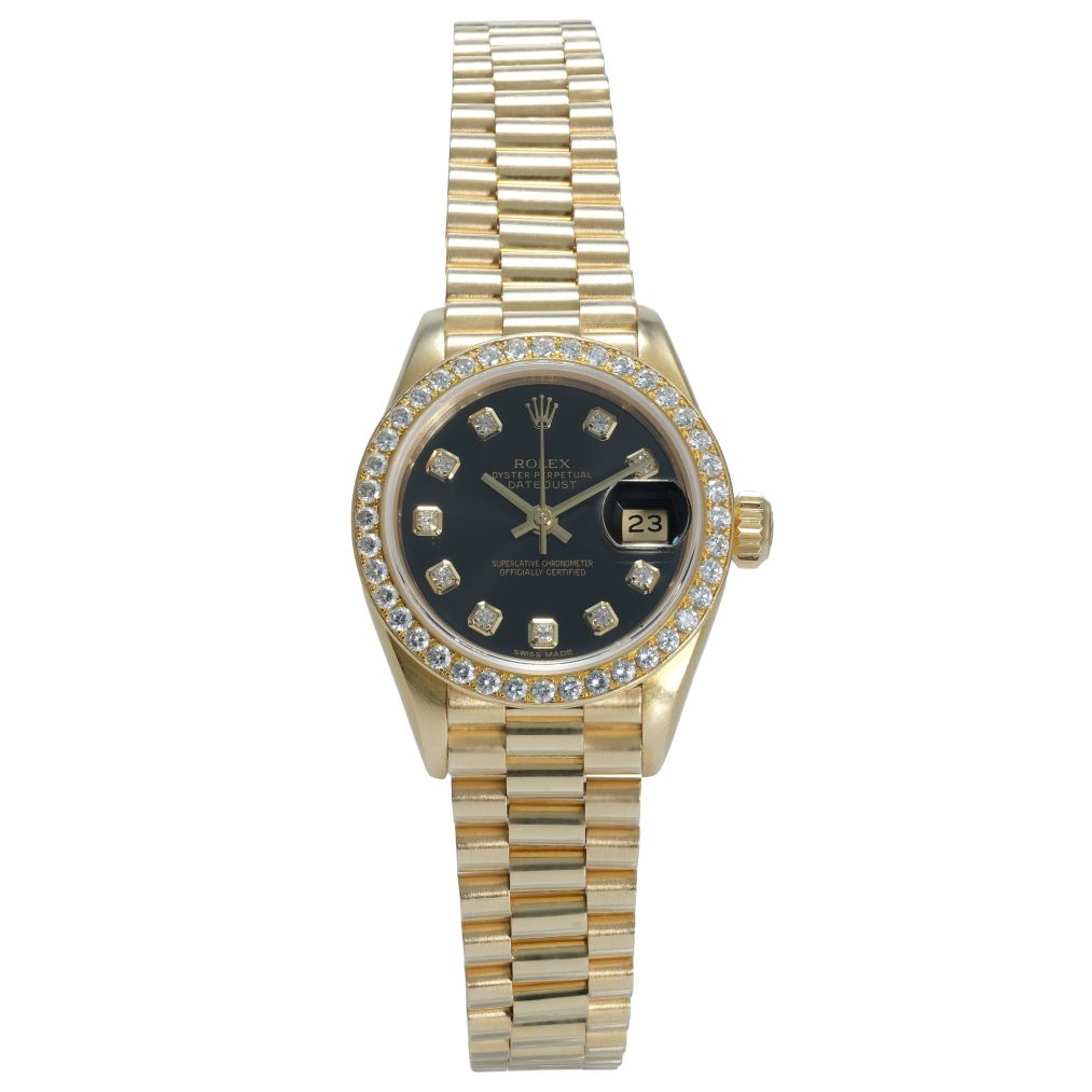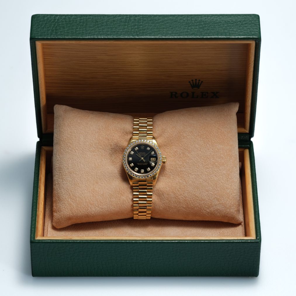 The yellow gold President bracelet completes the watch with a cohesive, prestigious aesthetic, offering both comfort and unmistakable sophistication. Despite lacking its original box and papers, the piece remains in very good condition, making it an attractive choice for collectors seeking a vintage, gem-set Rolex with strong visual impact. The combination of precious materials, timeless styling, and dependable mechanics ensures this example stands out as a particularly desirable model within the ladies’ Datejust range.