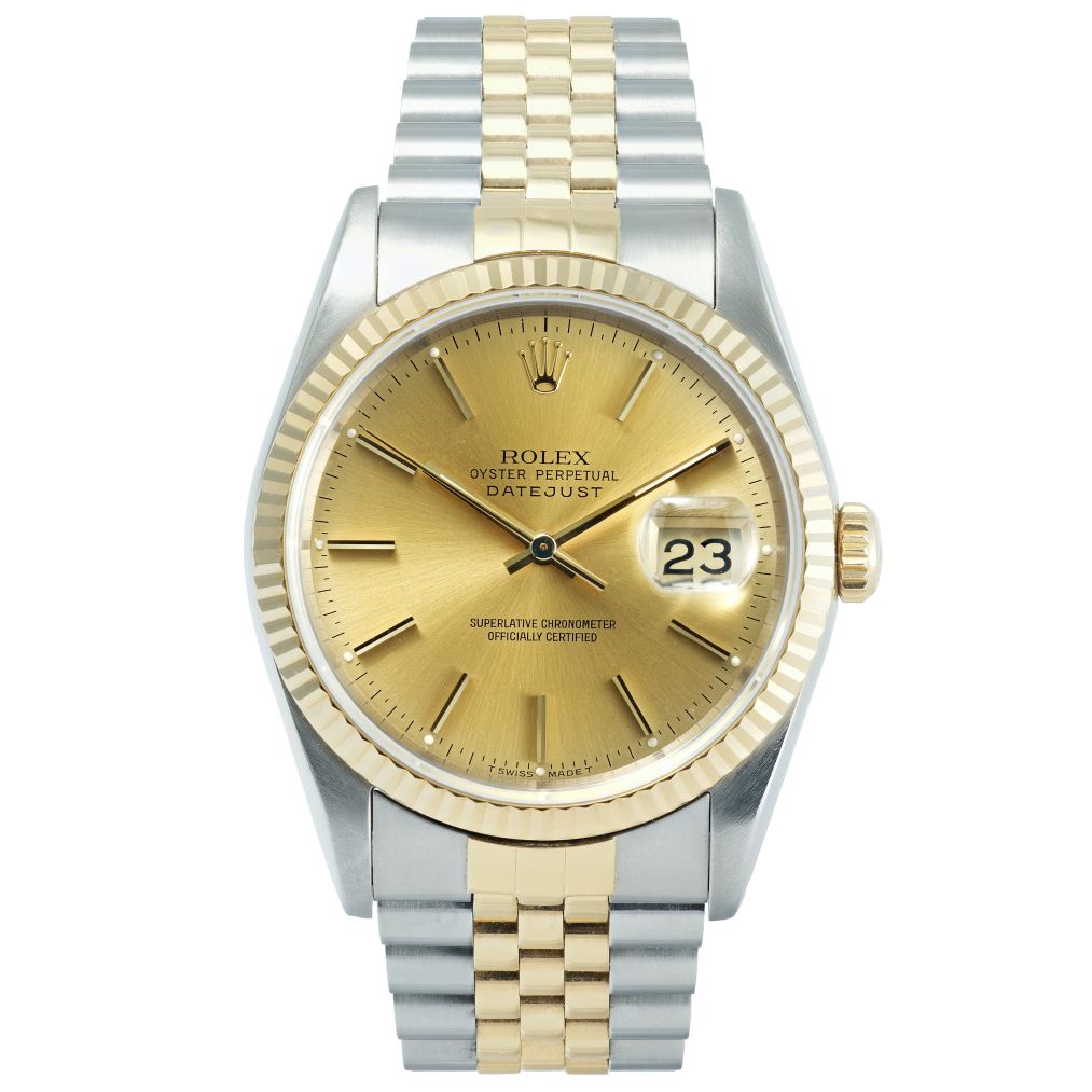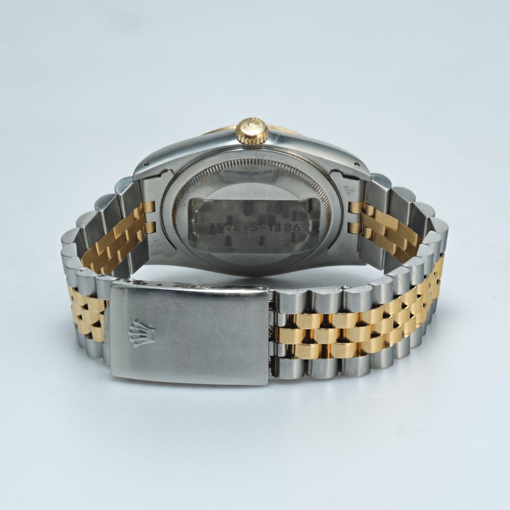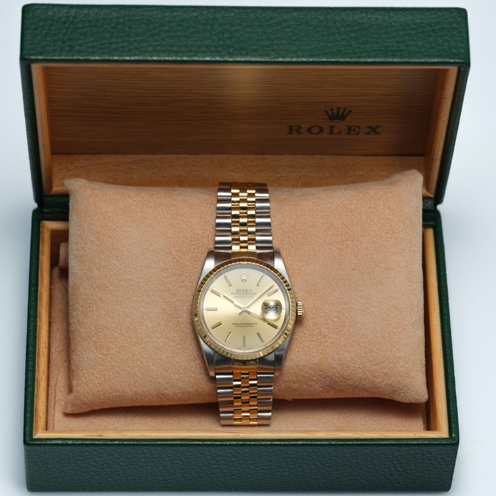 This Rolex Datejust 36 brings a classic and refined aesthetic to everyday wear, featuring a warm gold dial that catches light subtly and pairs beautifully with its polished stainless-steel case and bracelet. The 36 mm Oyster case balances elegant proportions with presence, while the smooth bezel and clean dial design give the watch a timeless look. The date window at 3 o’clock, topped with Rolex’s trademark Cyclops magnifier, ensures practical functionality while preserving the model’s signature symmetry and heritage style.
