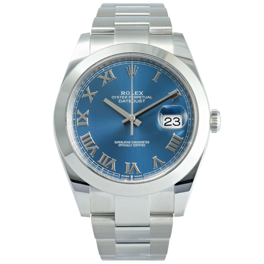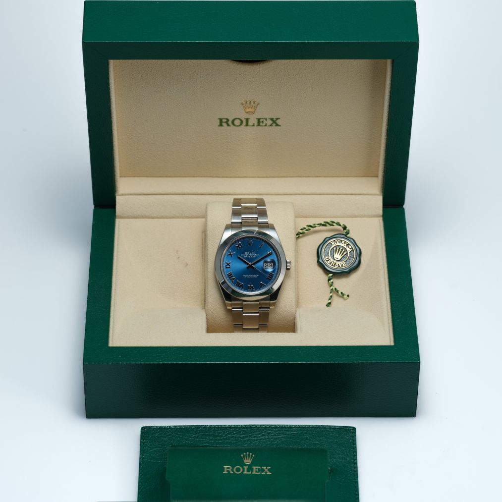This Rolex Datejust blends classic Rolex heritage with contemporary style, making it an exceptional choice for those who value refined everyday luxury. Housed in a 41 mm stainless steel case, this automatic timepiece showcases a radiant sunburst blue dial adorned with elegant Roman numerals, creating an unmistakably sophisticated aesthetic that’s both timeless and versatile. The smooth-finished bezel and robust Oystersteel construction ensure durability and enduring brilliance, while the iconic bracelet offers comfort with a touch of classic Rolex flair.
