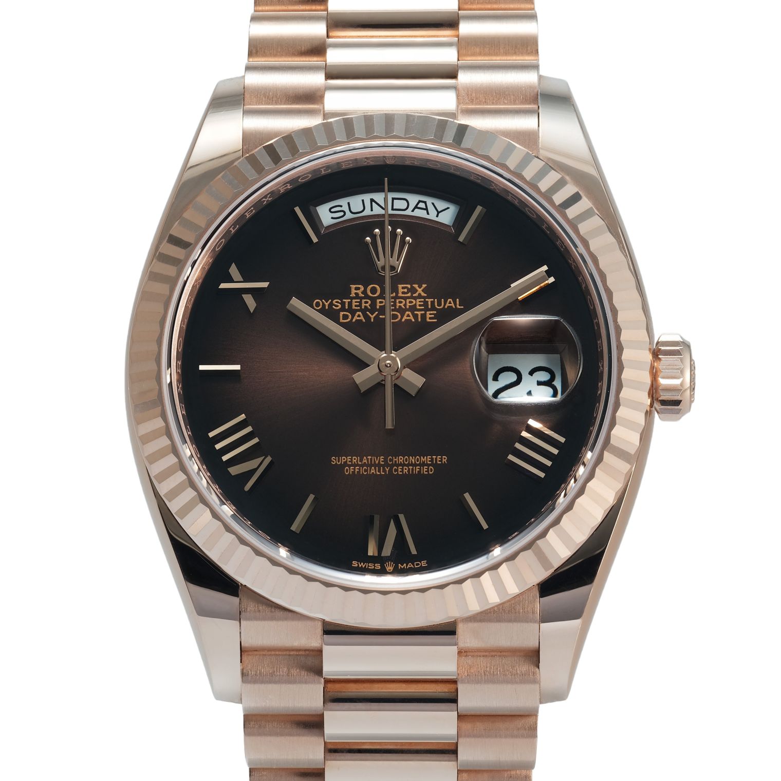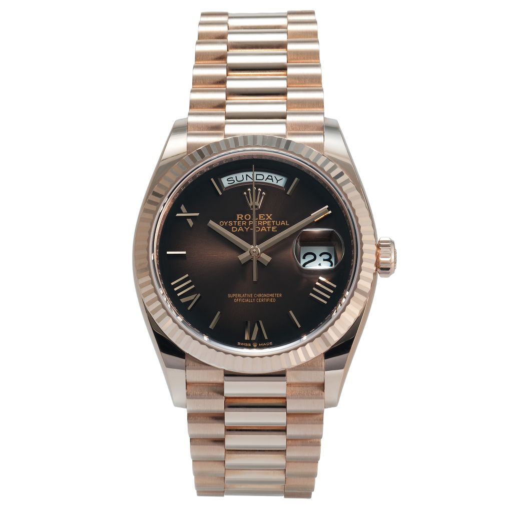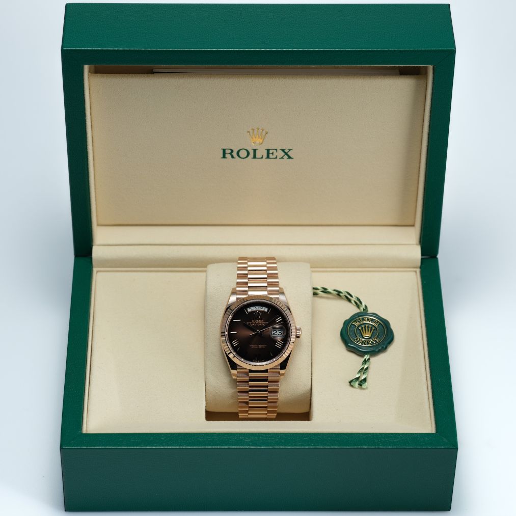 This Rolex Day-Date 36 is crafted entirely in luxurious Everose gold and paired with a rich chocolate dial, creating a warm and highly refined aesthetic. The 36 mm case offers classic proportions, while the polished finish enhances the watch’s elegant presence on the wrist. The chocolate dial provides beautiful depth and contrast against the Everose gold, complemented by the signature day display at 12 o’clock and date window at 3 o’clock, hallmarks of the iconic Day-Date collection.