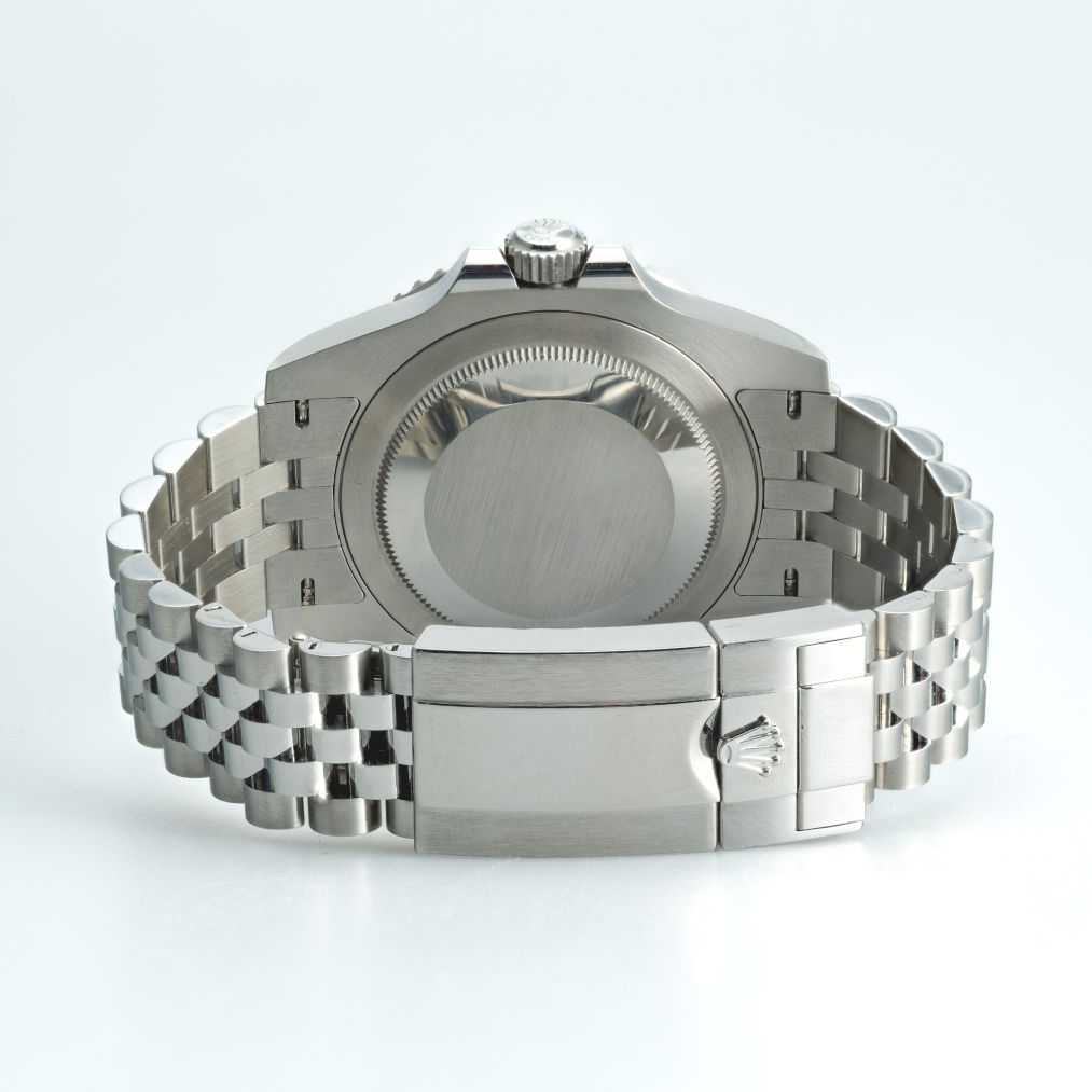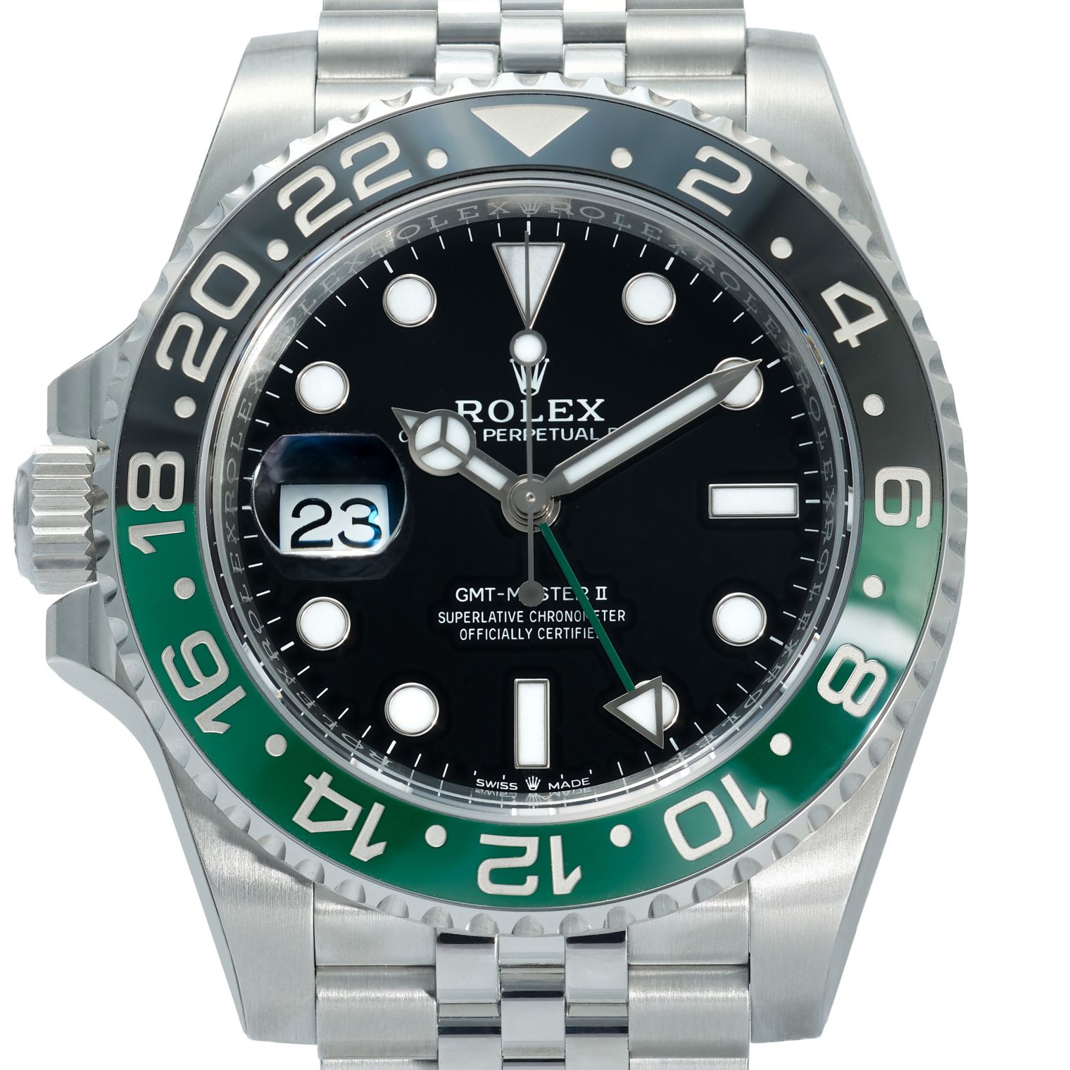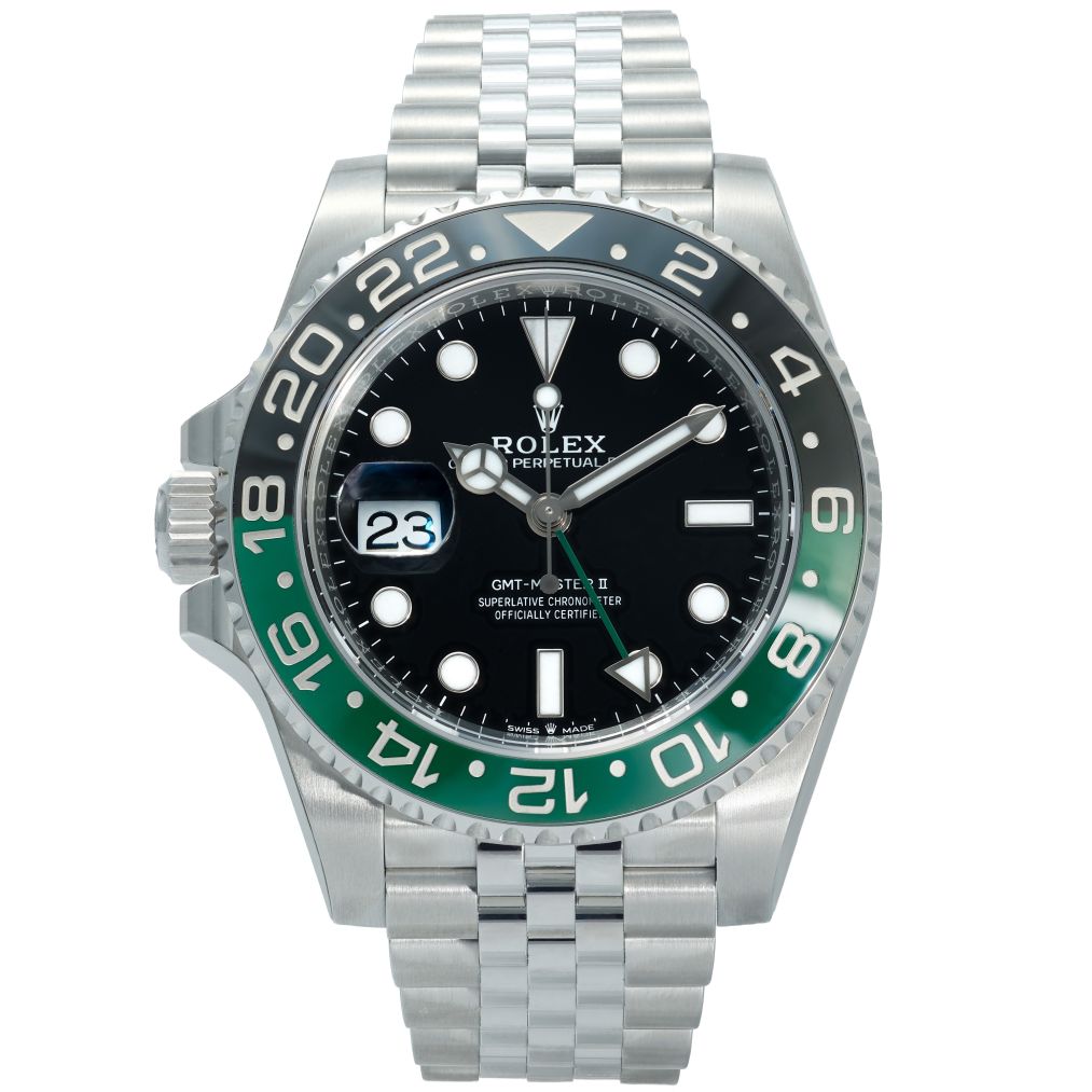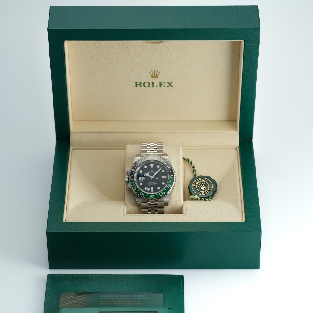The Rolex GMT-Master II Ref. 126720VTNR, nicknamed the “Sprite,” is one of the most distinctive modern GMT models thanks to its left-hand crown configuration. This 40mm stainless steel version features a black dial paired with a bi-colour green and black ceramic bezel, allowing tracking of a second time zone via the green 24-hour hand. Powered by the automatic calibre 3285 with a 70-hour power reserve, it maintains Rolex’s benchmark precision and durability. This 2024 example is in very good condition and comes complete with its original box and papers. A standout among contemporary Rolex sport models, the “Sprite” is already a sought-after addition to any GMT collection.