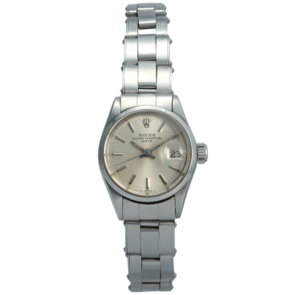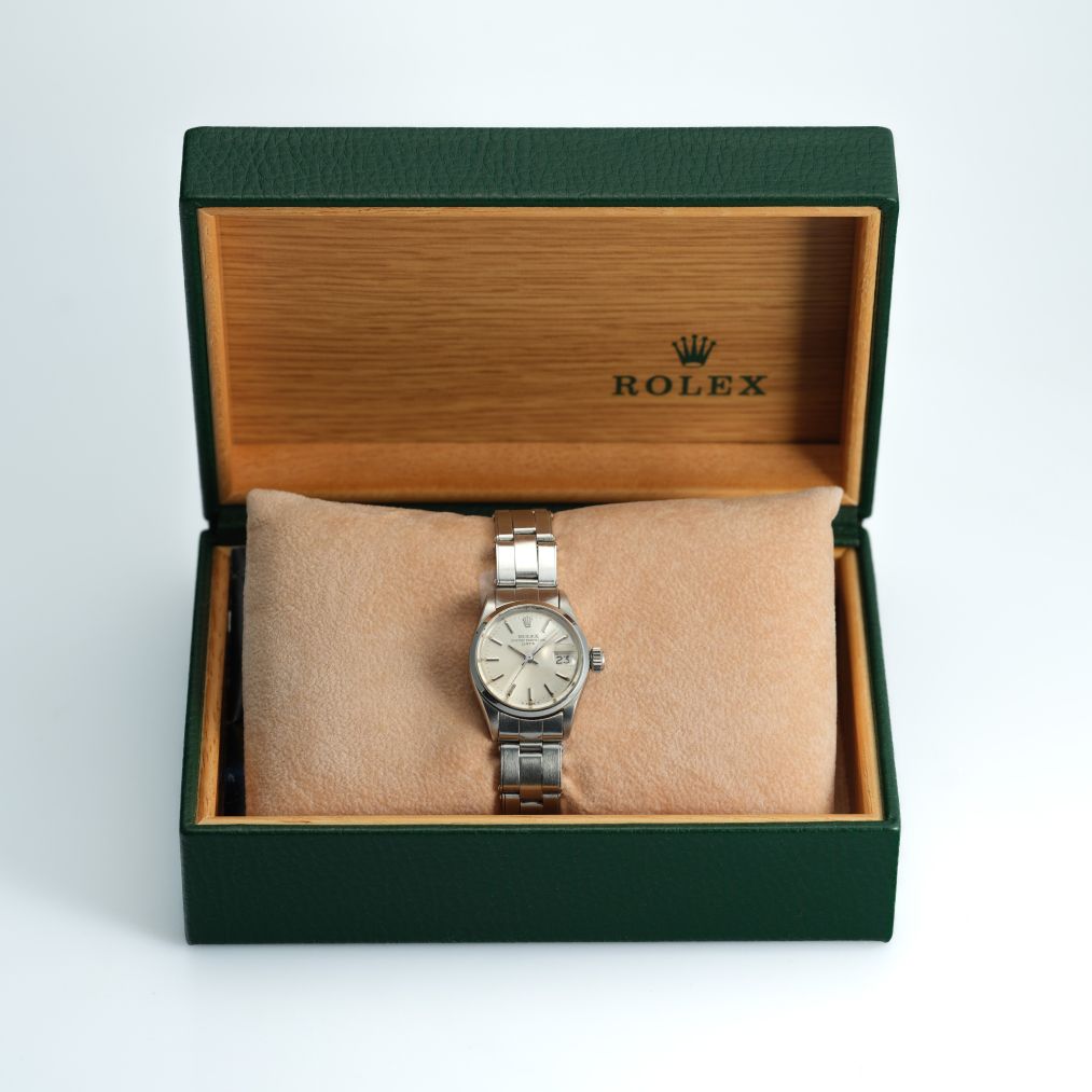 The Rolex Oyster Perpetual Date Ref. 6516, produced in the 1970s, is a refined vintage model in a 26mm stainless steel case with a matching Oyster bracelet. Its silver sunburst dial is marked by baton indices, slim hands, and the signature date aperture at 3 o’clock, enhanced by the Cyclops lens. Powered by an automatic movement and protected by a sapphire crystal, this piece embodies Rolex’s enduring balance of elegance and reliability. Offered in very good condition and accompanied by its original box, it represents an attractive entry into the world of vintage Rolex.