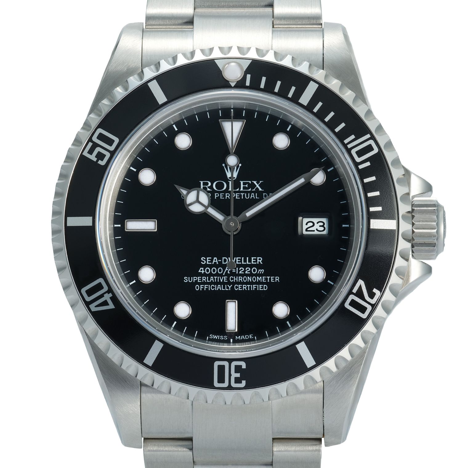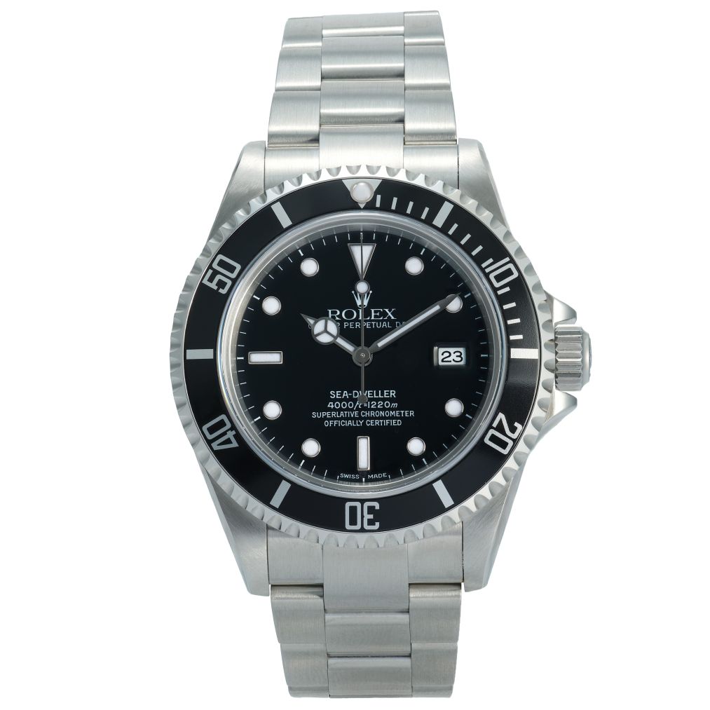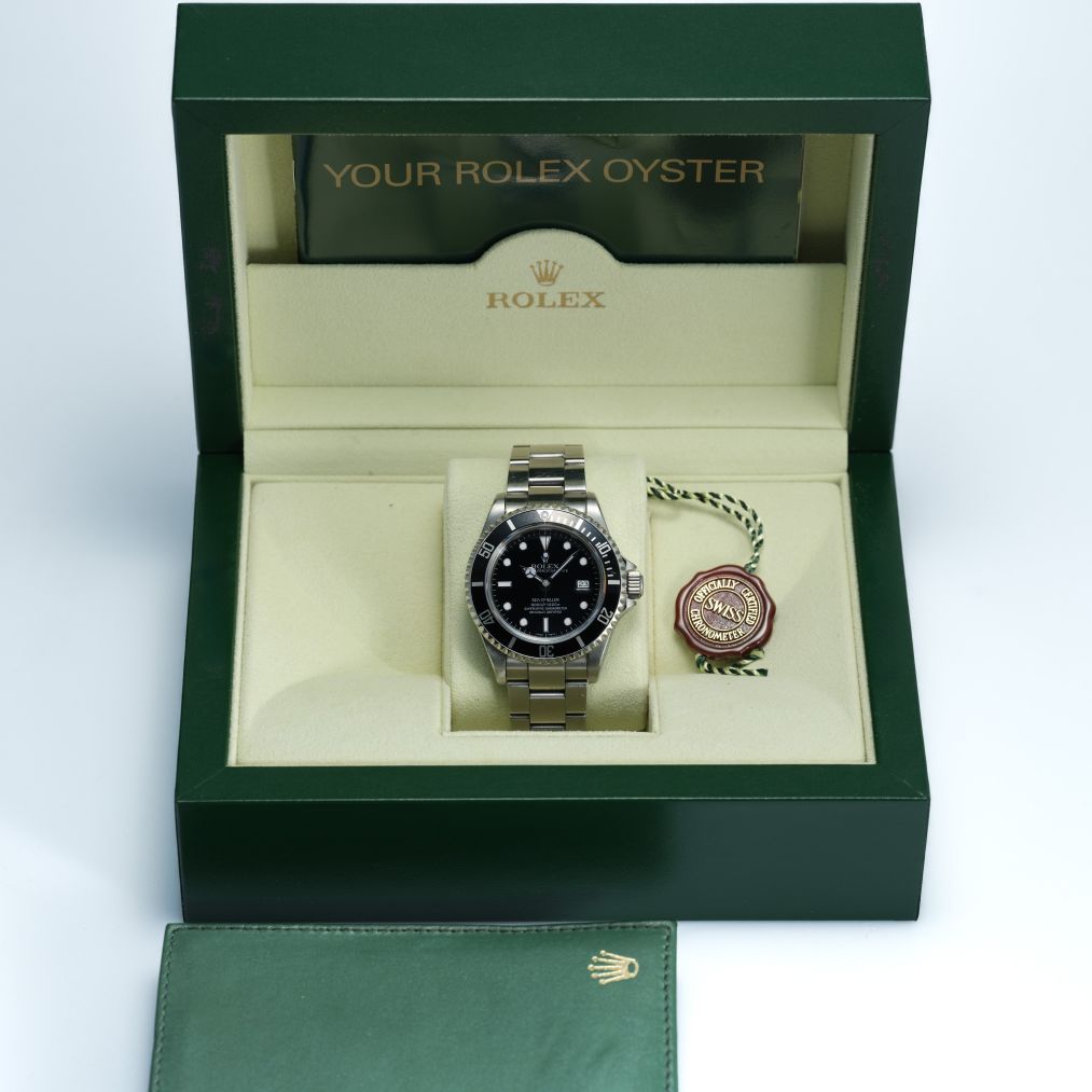 In very good condition and accompanied by both its box and papers, this example provides strong assurance of originality and care. The stainless-steel bracelet enhances its durability and everyday wearability, and the watch retains the timeless look that made the ref. 16600 the last of the classic Sea-Dwellers before later generations increased in size and design complexity. This piece represents a dependable and highly respected professional diver’s watch with enduring appeal.