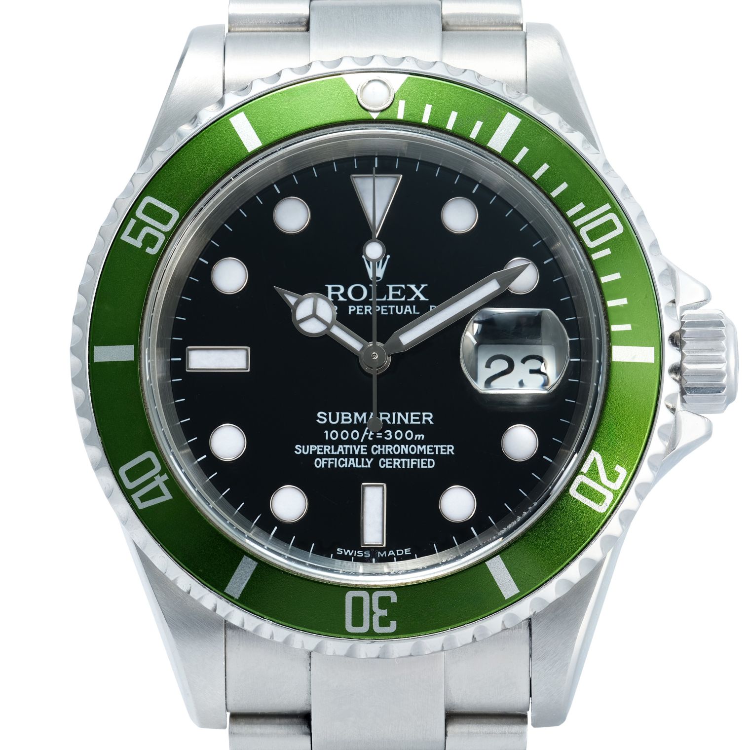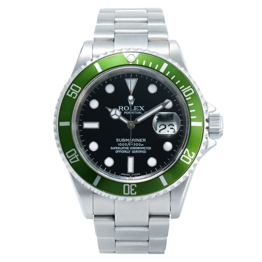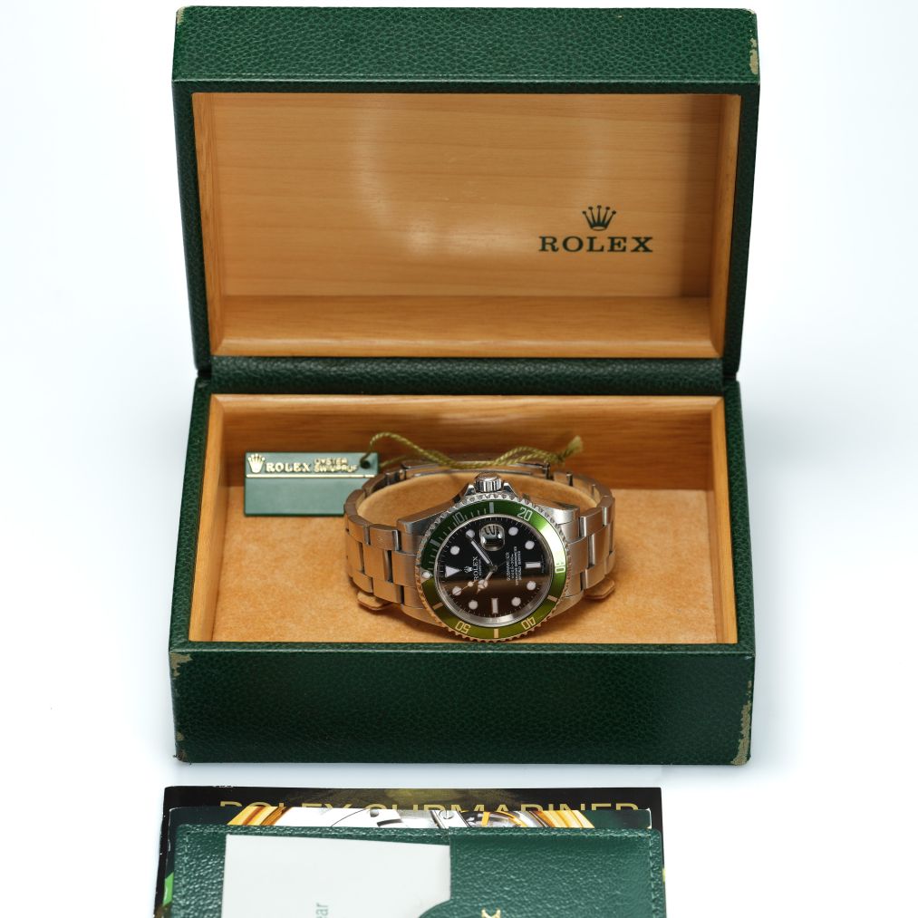 The Rolex Submariner Ref. 16610LV 'Flat 4', affectionately known as the “Kermit,” celebrates the Submariner’s 50th anniversary with its vibrant green aluminium bezel set against a classic black dial. Measuring 40mm in stainless steel, it houses an automatic movement beneath a sapphire crystal and is mounted on an Oyster bracelet. Produced in 2004, this example remains in very good condition and comes complete with box and papers. A highly collectible milestone in Submariner history.
