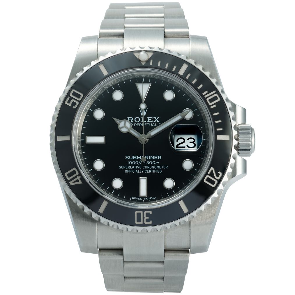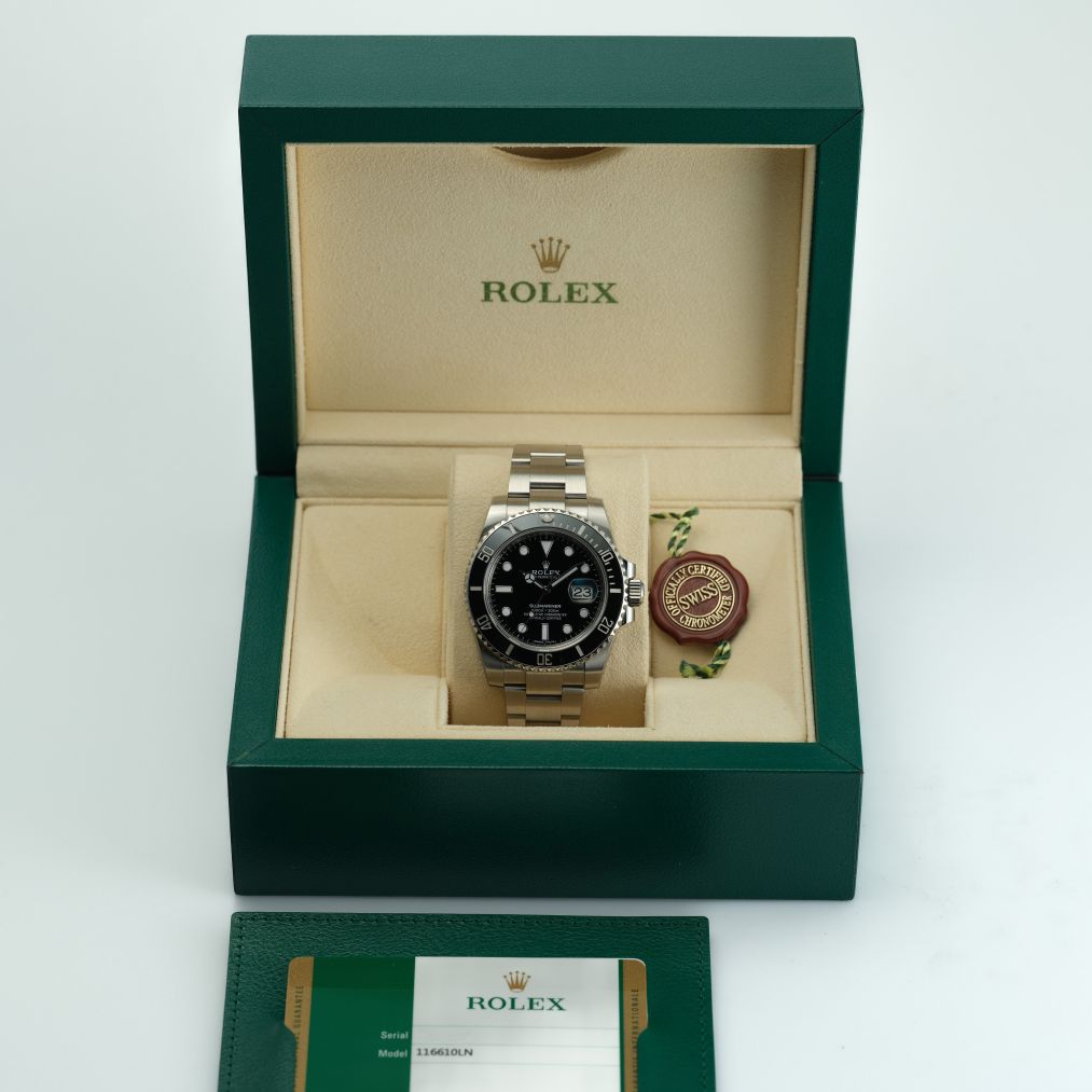 The Rolex Submariner Date Ref. 116610LN offers the enduring dive watch formula in a 40mm stainless steel case with a robust black ceramic bezel. Its black dial features luminous hour markers and hands for legibility underwater, with the date displayed at 3 o’clock beneath a Cyclops lens. Powered by an automatic movement and protected by sapphire crystal, this 2019 example is in very good condition, complete with box and papers. A benchmark modern dive watch.