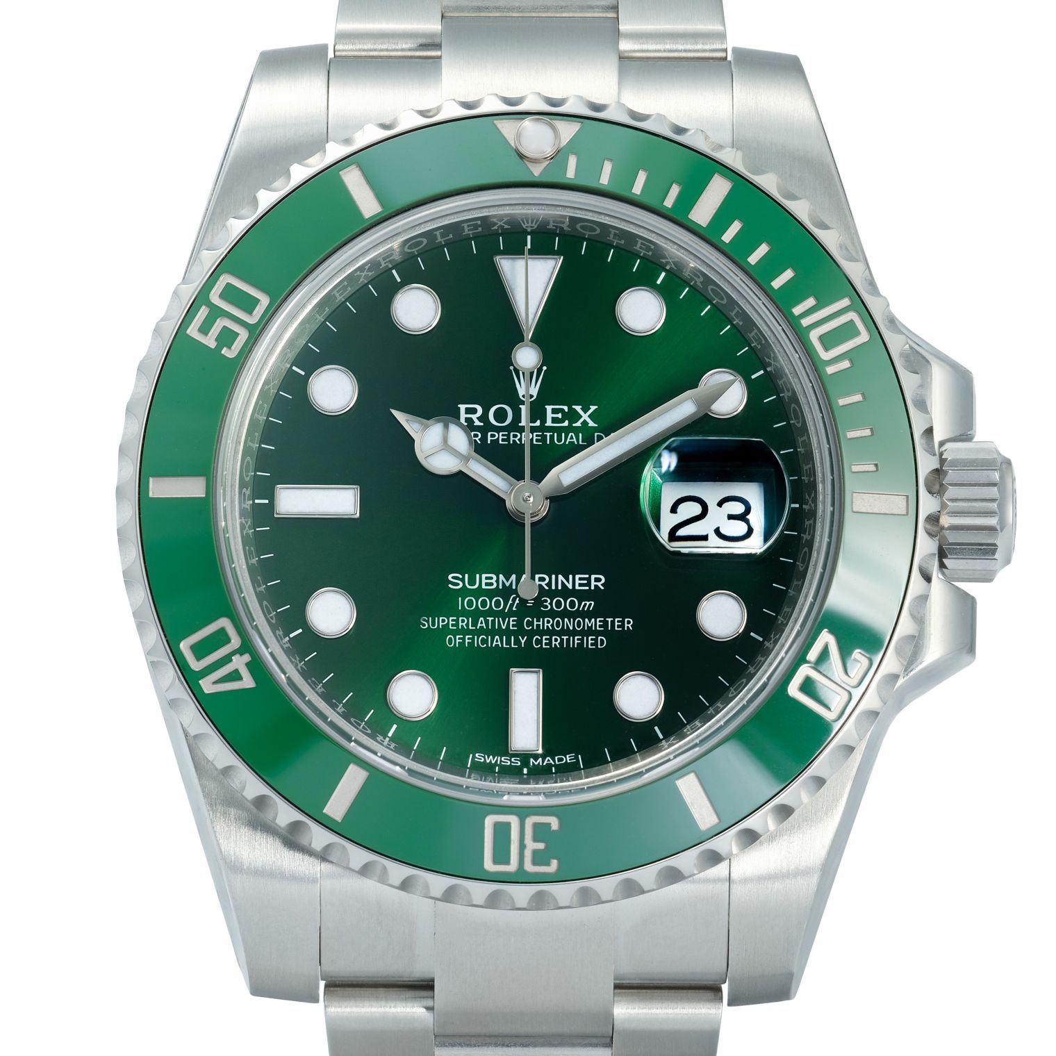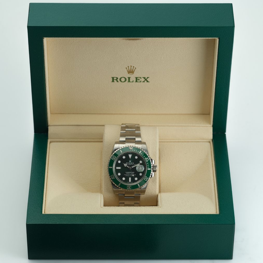 Powered by Rolex’s automatic movement and protected by a scratch-resistant sapphire crystal, this Submariner offers reliability and durability suited for both everyday wear and underwater adventures. The stainless-steel Oyster bracelet adds comfort and classic utility, making this reference a versatile timepiece that transitions effortlessly from wetsuit to business suit. For anyone seeking a Submariner with bold style and strong heritage, this green-dial, green-bezel version delivers a distinctive yet unmistakably Rolex presence.