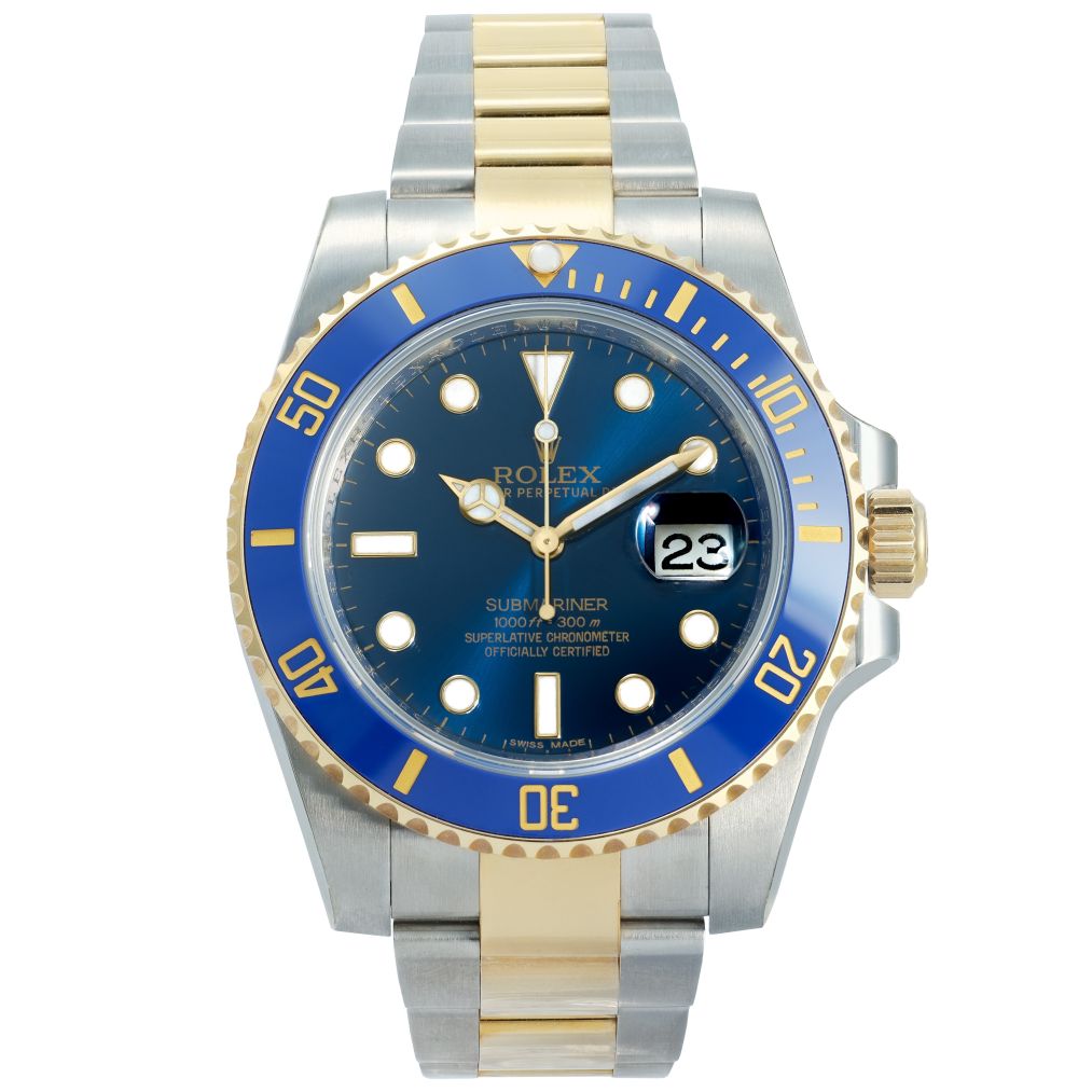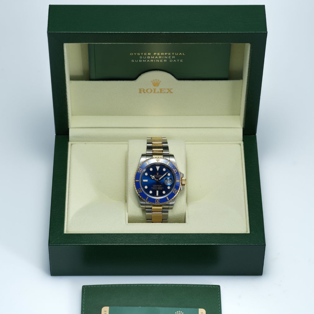 This Rolex Submariner Date 40 in a stainless-steel and yellow-gold configuration pairs rugged dive-watch capability with refined, two-tone elegance. The vibrant blue dial offers exceptional contrast and legibility, beautifully complemented by the yellow-gold accents on the bezel and bracelet centre links. Classic Submariner elements — including bold luminous hour markers, Mercedes-style hands, and the unidirectional rotating bezel — underscore the model’s heritage as a professional dive watch, while the Cyclops-magnified date window at 3 o’clock adds everyday practicality.